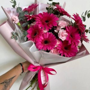 Cotton Candy Bloom is a sweet and dreamy bouquet designed in soft shades of pink. Featuring delicate pink chrysanthemums, vibrant pink roses, and airy baby’s breath, this charming arrangement is beautifully wrapped in pastel pink paper and finished with a satin ribbon.