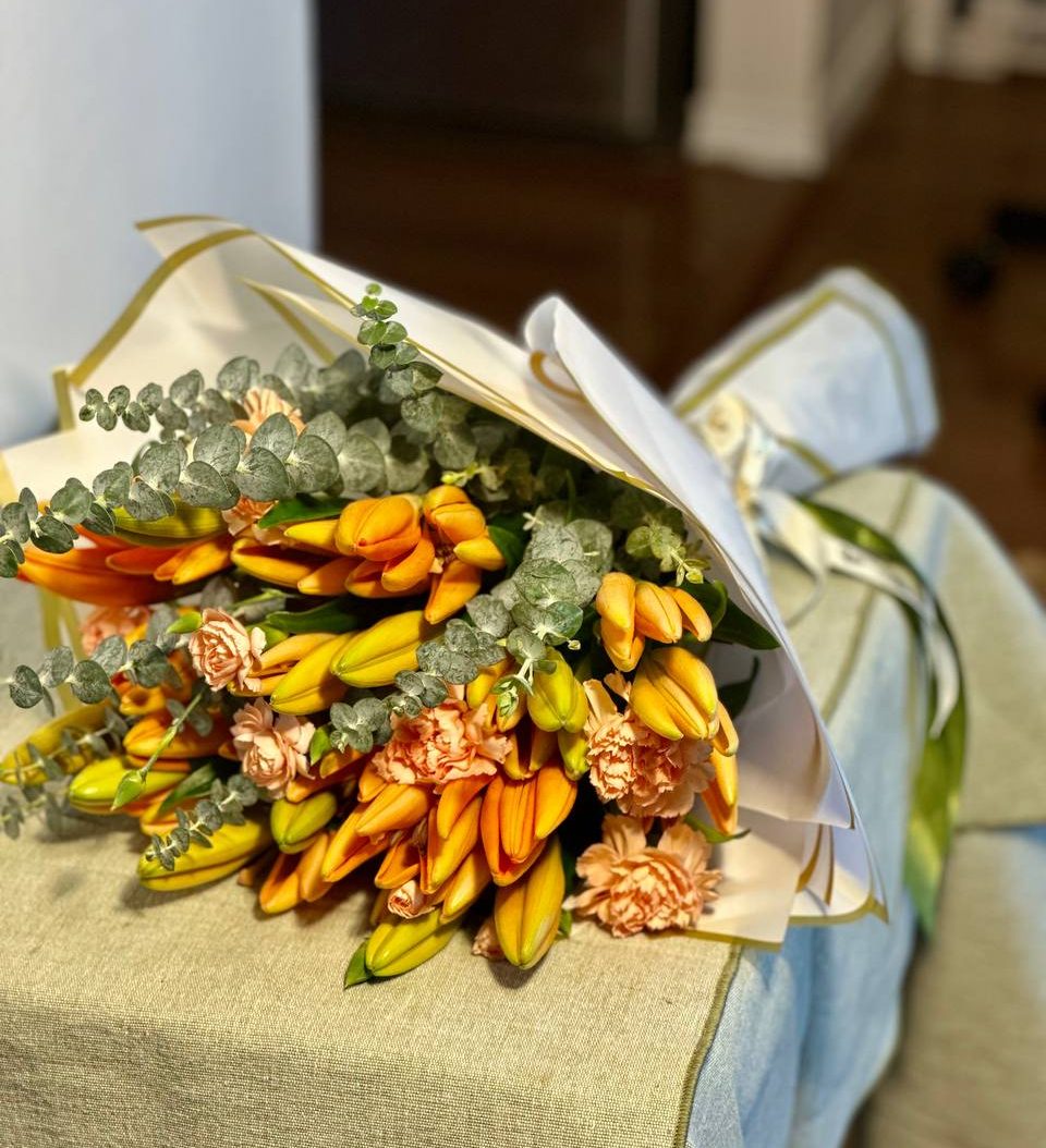 Golden Blush is a warm and beautiful bouquet with orange lilies, soft peach carnations, and fresh eucalyptus. The bright colors make it feel cheerful, while the soft flowers add a calm and gentle touch.