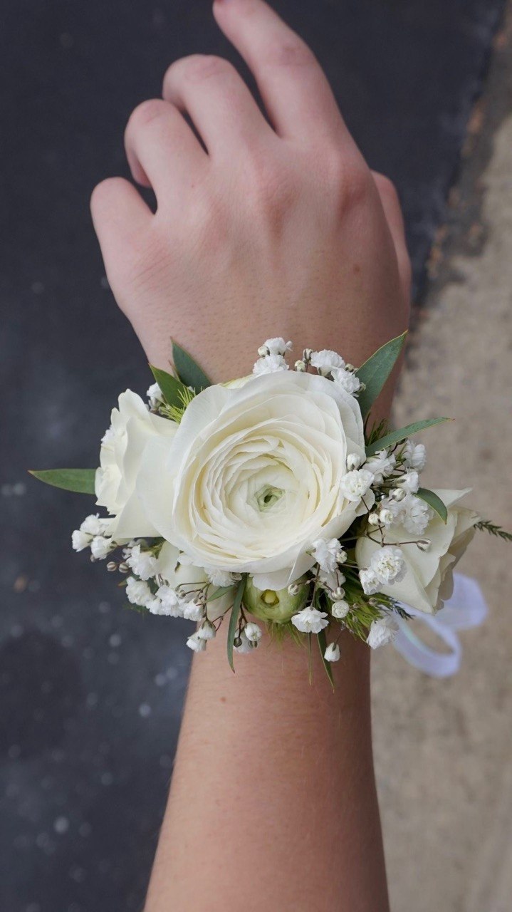 Overall, the Ivory Bloom Wrist Corsage is a perfect choice for weddings. It combines soft florals, gentle texture, and a natural design. As a result, it adds elegance and charm to any wedding outfit.