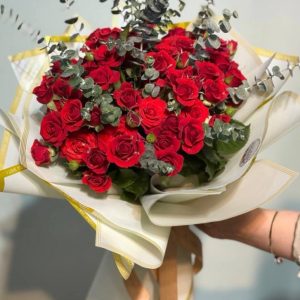 A bouquet like this is made to turn an ordinary moment into something unforgettable. Dozens of red roses, each one perfectly bloomed and wrapped with care, come together to create a rich, romantic look that never goes out of style. The deep red color stands for love, passion, and care — it’s the kind of gift that speaks straight from the heart.