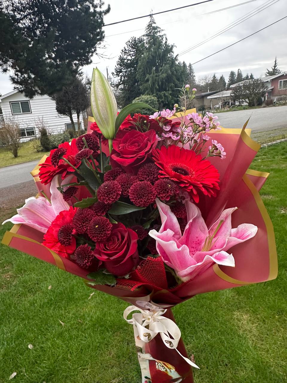 The deep red tones symbolize love and desire, while the soft pink lilies add elegance and charm. Perfect for Valentine’s Day, anniversaries, or any moment that deserves a grand romantic gesture. Handcrafted with fresh blooms to leave a lasting impression.